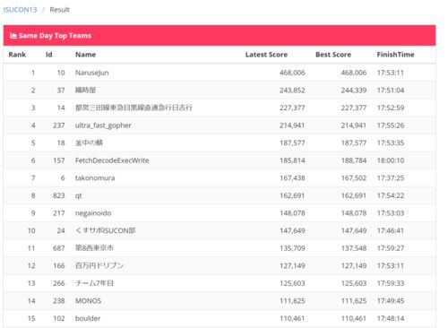 今年も来ましたISUCONの季節。遅くなりましたがブログ記事となります。 いつもの頼れる後輩syusui、abcangとチーム7年目として出場し、全体12位 + 株式会社アークエッジ・スペース様の打ち上げ成功賞をいただきました! 株式会社アークエッジ・スペース様の…